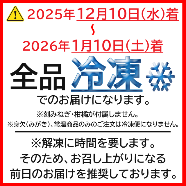 | 配送温度帯 | 冷蔵 *¹*² *¹通年、北海道と沖縄県への配送は、 冷凍配送のみとなります。 *²12月10日着〜1月上旬までのお届けは、すべて冷凍配送でお届けします。 |